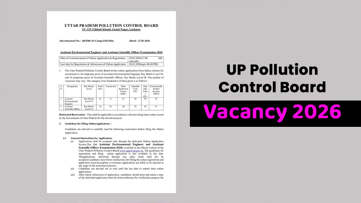 UPPCB Recruitment 2026: यूपीपीसीबी भर्ती 2026 के तहत 26 सहायक पर्यावरण इंजीनियर और 14 सहायक वैज्ञानिक अधिकारी पदों के लिए आधिकारिक अधिसूचना जारी की गई है। इन पदों के लिए उम्मीदवार को 400 अंकों की सीबीटी और 70 अंकों का इंटरव्यू देना होगा। इस भर्ती के तहत सहायक पर्यावरण अभियंता और सहायक वैज्ञानिक अधिकारी के पदों पर 40 रिक्तियां पर नियुक्ति होगी। इच्छुक उम्मीदवार इन पदों के लिए ऑनलाइन आवेदन कर सकते हैं। आवेदन करने की आखिरी तिथि 28 मार्च, 2026 है। वे उम्मीदवार जो इन पदों पर आवेदन करना चाहते हैं, नीचे पढ़ें वैकेंसी से जुड़ी जरुरी डिटेल्स।