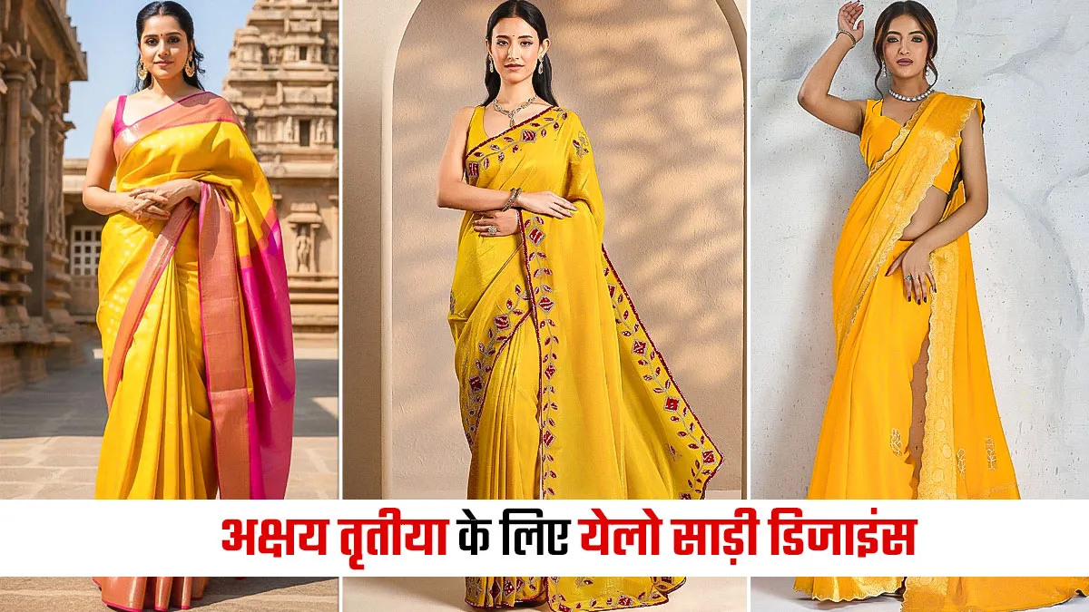 Yellow Colour Saree Designs: त्योहारों पर सजना हम सभी को पसंद होता है। इसलिए हम अक्सर अलग-अलग तरह के डिजाइंस वाली साड़ियों को खरीदते हैं, जिसे वियर करके हम खूबसूरत नजर आएं। इसके लिए आप पीले रंग की साड़ियों को वियर कर सकती हैं। साड़ियों में आपको कई सारे अलग-अलग डिजाइंस के ऑप्शन मिल जाएंगे, जिसे आप अक्षय तृतीया के मौके पर वियर कर सकती हैं।