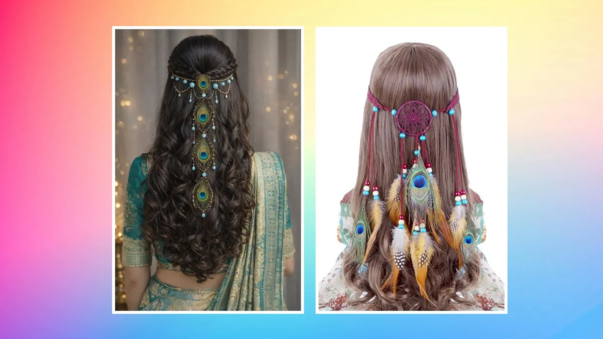 Peacock Feather Accessories: अधिकतर महिलाओं को हेयर स्टाइल बनाना बहुत पसंद होता है। ऐसे में अगर आप भी किसी खास मौके पर अपने बालों को अट्रैक्टिव बनाना चाहती हैं, तो अब आप हेयर स्टाइल के साथ कुछ लेटेस्ट और डिजाइनर पीकॉक हेयर एक्सेसरीज को शामिल कर सकती हैं। आज हम आपको इस खबर के जरिए लेटेस्ट मोर पंख हेयर एक्सेसरीज के डिजाइंस बताएंगे। आइए जानते हैं इसके बारे में।