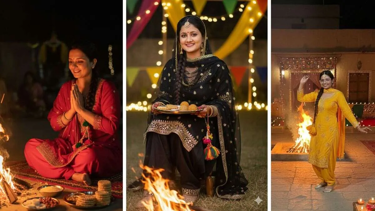 सूट परांदे के साथ मेरी फोटो को खुबसूरत शाम के लोहड़ी लुक में बनाएं। रात हो रही है, मेरे सामने अग्नि जल रही है, पीछे लोग धुंधले हैं और मैं मुस्कुराते हुए लोहड़ी में तिल डाल रही हूं। मेरा चेहरा कैमरे की तरफ है।