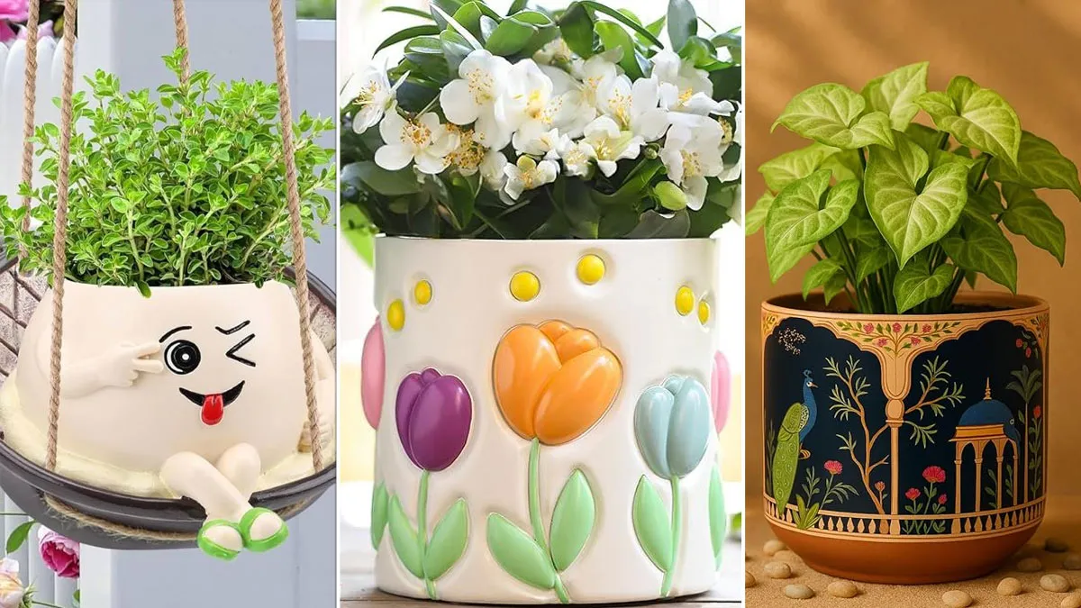 अगर आप अपनी बालकनी में फ्लोरल पैटर्न वाले सिरेमिक कप प्लांटर लगाना चाहती हैं, तो हाथ से पेंट किए गमले बेस्ट हैं। इनमें मधुबनी आर्ट, फ्लोरल प्रिंट्स या राजस्थानी मोटिफ्स देखने को मिलते हैं। ये कलरफुल कप्स बोरिंग सी दिखने वाली बालकनी में भी जान फूंक देते हैं। इन्हें आप बालकनी के कोनों में छोटे स्टैंड्स पर सजा सकती हैं। खास बात यह है कि ये मिट्टी के साधारण गमलों की तरह पानी सोखकर काले नहीं पड़ते, बल्कि इनकी चमक सालों-साल बनी रहती है।