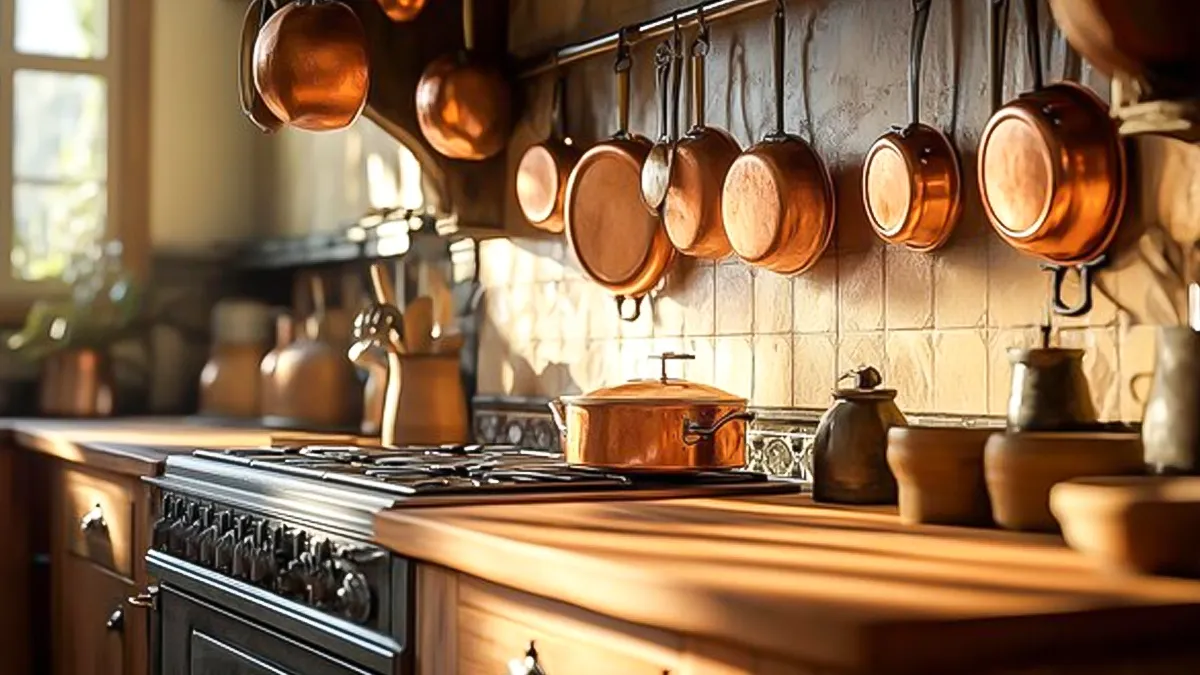 Now, this might seem like a silly idea to many, but trust us, this makes your kitchen look very aesthetic. A ceiling-mounted pot rack or a sleek wall-mounted pegboard keeps high-quality copper or cast-iron cookware within arm's reach. It’s a functional design choice that will make cooking super easy as well.